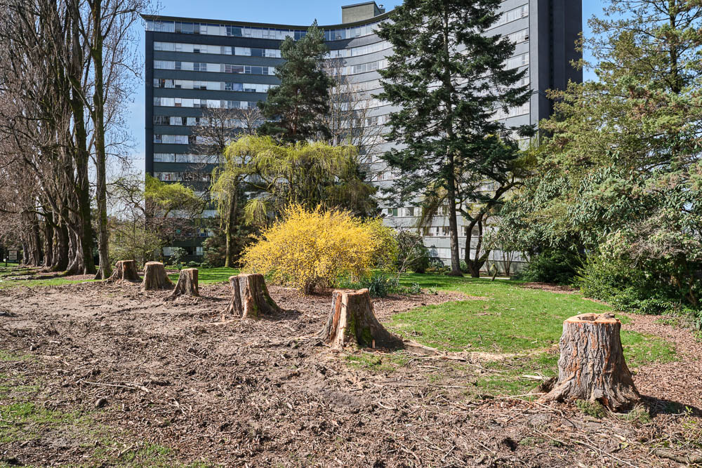March 31st, 2026 — Trees at the corner of Burrard Street and Cornwell were cut down to make way for a bus stop at the Senakw housing development. Below, as they were on March 6th.