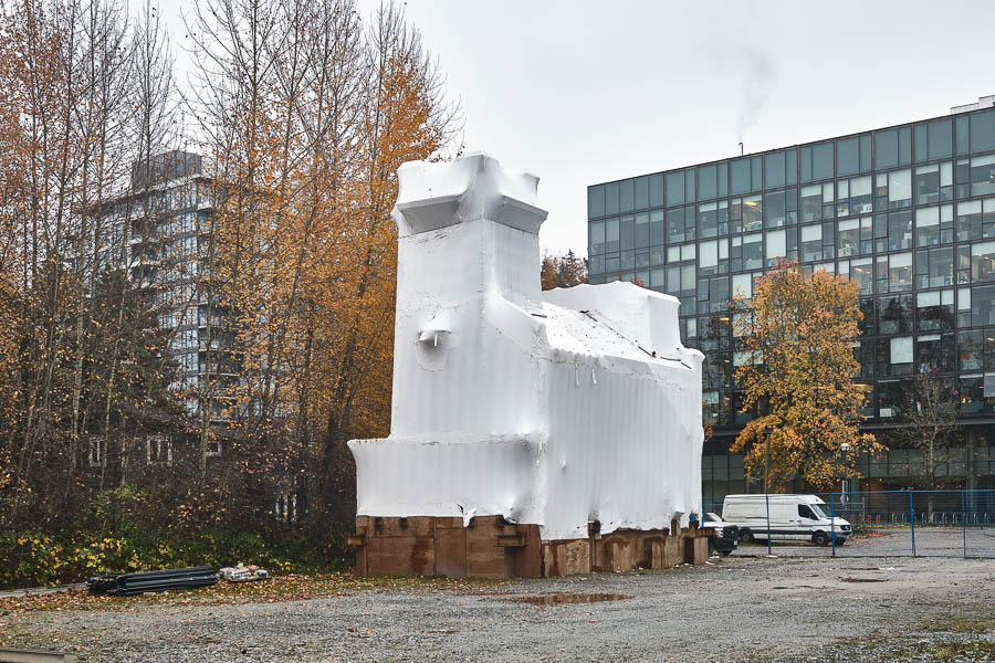November 21st, 2025 — A strange wrapped object on Agronomy Road west of Wesbrook Mall at UBC; a Trojan horse?