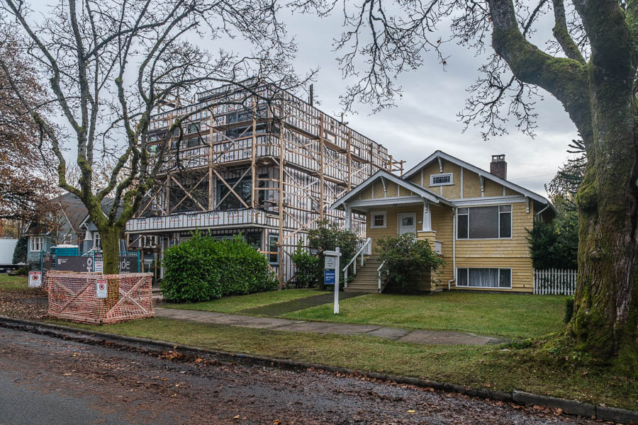 November 9th, 2025 — A new type of Vancouver special, the six-plex, goes up next to a craftsman bungalow built almost a 100 years ago on West 11th Avenue.
