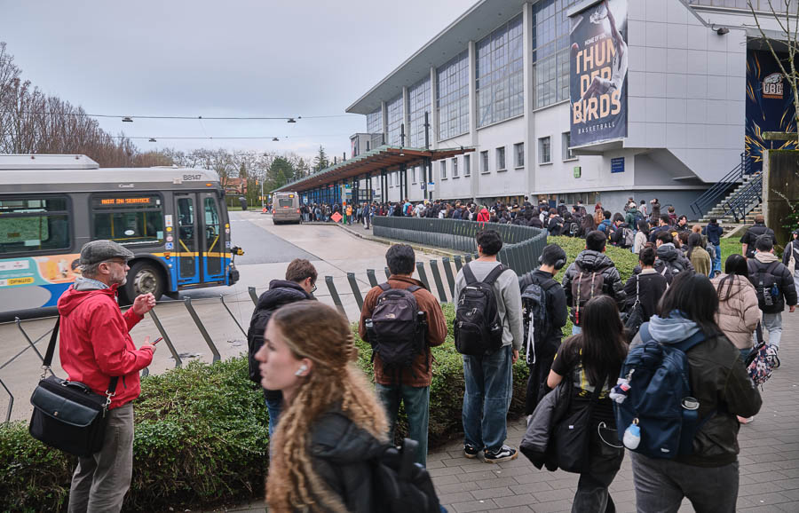 January 13th, 2026 — UBC students lining up for the bus at Thunderbird Stadium.